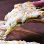 Spinach Alfredo Pizza is a delicious creamy white sauce recipe, topped with tender shredded chicken, baby spinach, mushrooms and melty mozzarella.