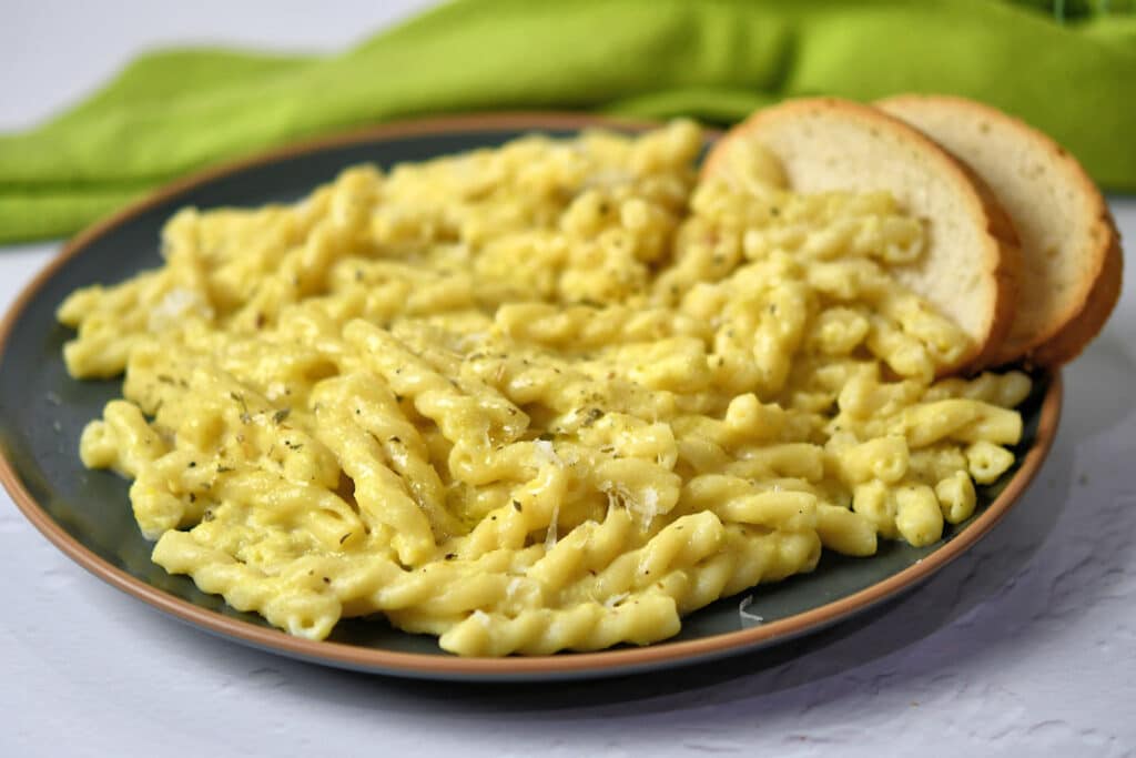 I used a smaller pasta shape called Gemelli. It’s a thin, twisted pasta. They are nice, small bites, perfect for even kids. This makes this sauce great for fussy toddlers. It’s the same color as macaroni and cheese which gives the added nutrition of some hidden vegetables.